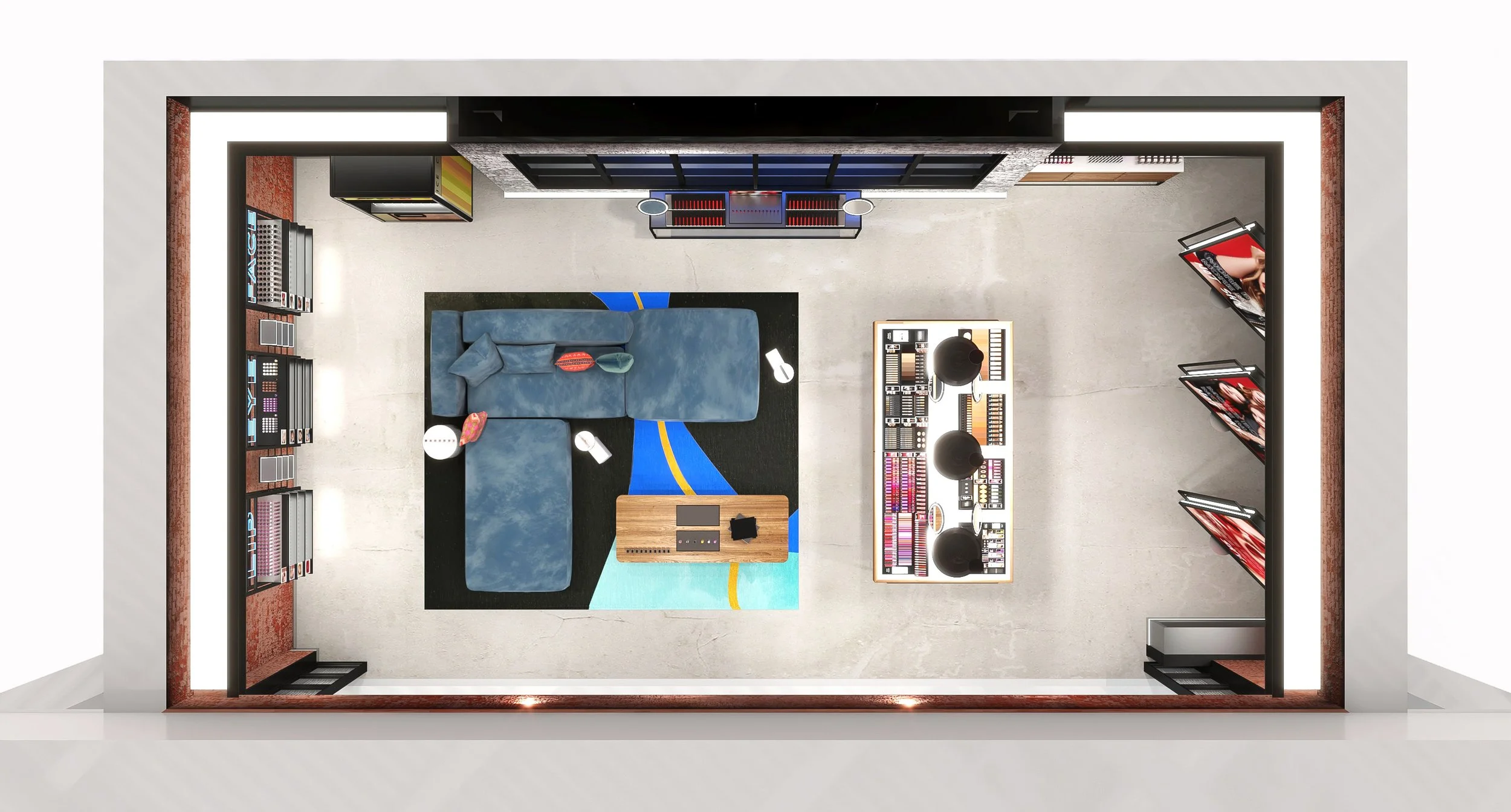 Seating / hangout area with digital services like virtual try-on and foundation finder.