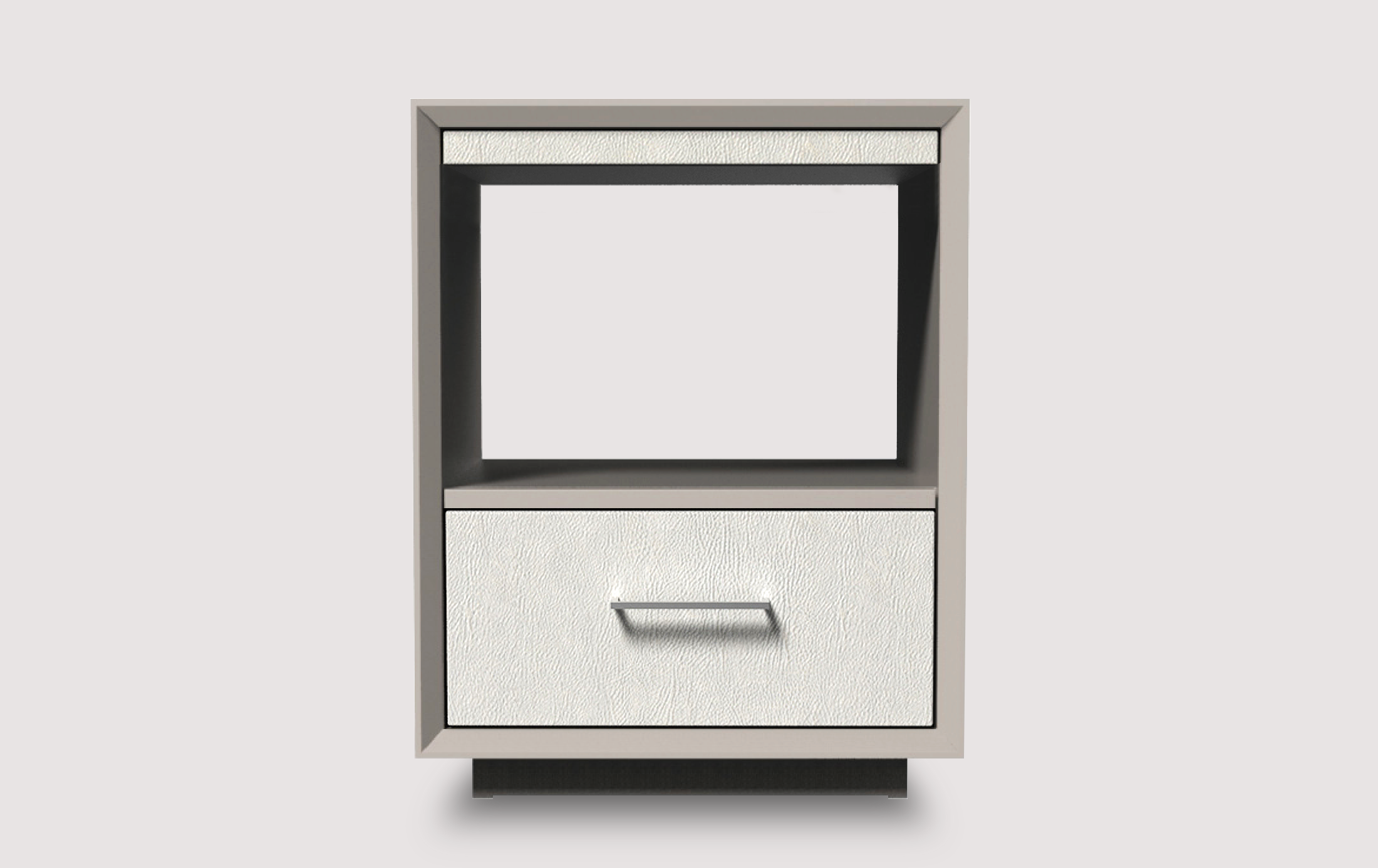 It is made out of a high quality dove-grey lacquered MDF with soft cream